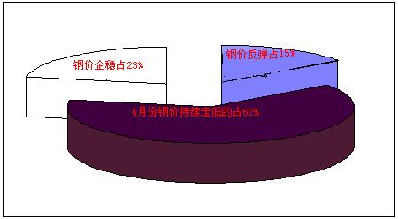 廠家市場調(diào)研情況來看,如下圖所示:對于4月鋼材行情都持不懂看法,其中認為“鋼價能有小幅反彈”的占15%,“鋼價會延續(xù)下跌”的占62%,“鐵價逐漸企穩(wěn)”的占23%。由此可見,過半數(shù)廠家對后市預期仍較悲觀,而且3月之前鋼價的反彈并沒有給廠家?guī)矶啻蟮男判模^續(xù)看跌的商家較4月初有所增加,最近鋼材市場有降價走勢,漲缺乏實質性需求支撐,動力不足,而受低庫存及高成本支撐,下跌難有空間。短期來看,熱軋價格就這么弱勢維持。